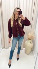 Stay cozy and chic with this oversized claret sweater, designed for a relaxed and comfortable fit. The soft knit fabric drapes beautifully, while the bow tie detail at the cardigan front adds a subtle feminine touch. Perfect for layering over everyday outfits, casual weekends, or cozy indoor days.